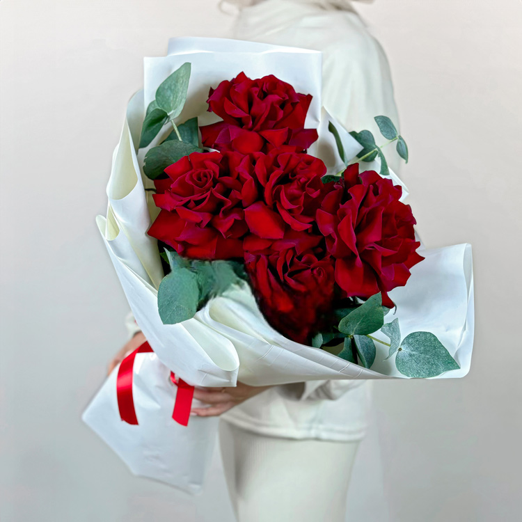 Букет из 5 красных роз с эвкалиптом в матовой упаковке